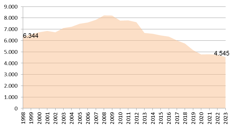 La TGF asturiana de 2023 se sitúa en un valor muy próximo al que existía en 1995 y muy cercano al mínimo histórico alcanzado en 1998. De hecho, desde el inicio de la serie que publica el INE esta tasa no ha dejado de caer, con la excepción del periodo 1998-2008.