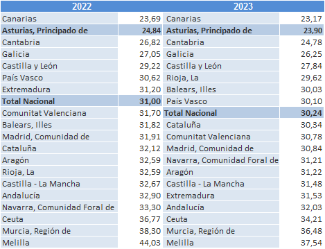 Asturias mantiene el segundo puesto entre las Comunidades Autónomas españolas con menor tasa de España, sólo por detrás de Canarias (5).