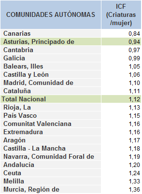 Otra medida de la natalidad la da el Indicador Coyuntural de Fecundidad (ICF), que representa el número promedio de hijos/as que tendría una mujer al final de su vida reproductiva, suponiendo que a cada edad tuviera el comportamiento reproductivo promedio de dicha edad. En promedio, cada mujer tiene 0,94 criaturas a lo largo de su vida, según datos de 2023. Es otra medida de la fecundidad, que permite visualizar de qué manera contribuye la fecundidad al tamaño de las poblaciones en el futuro. En Asturias el valor del ICF se redujo 3 centésimas respecto al año anterior. Aunque no hay ninguna Comunidad Autónoma que alcance la Tasa de reposición[1], de nuevo el Principado es la segunda comunidad con un indicador más bajo de España, sólo por delante de Canarias (5).