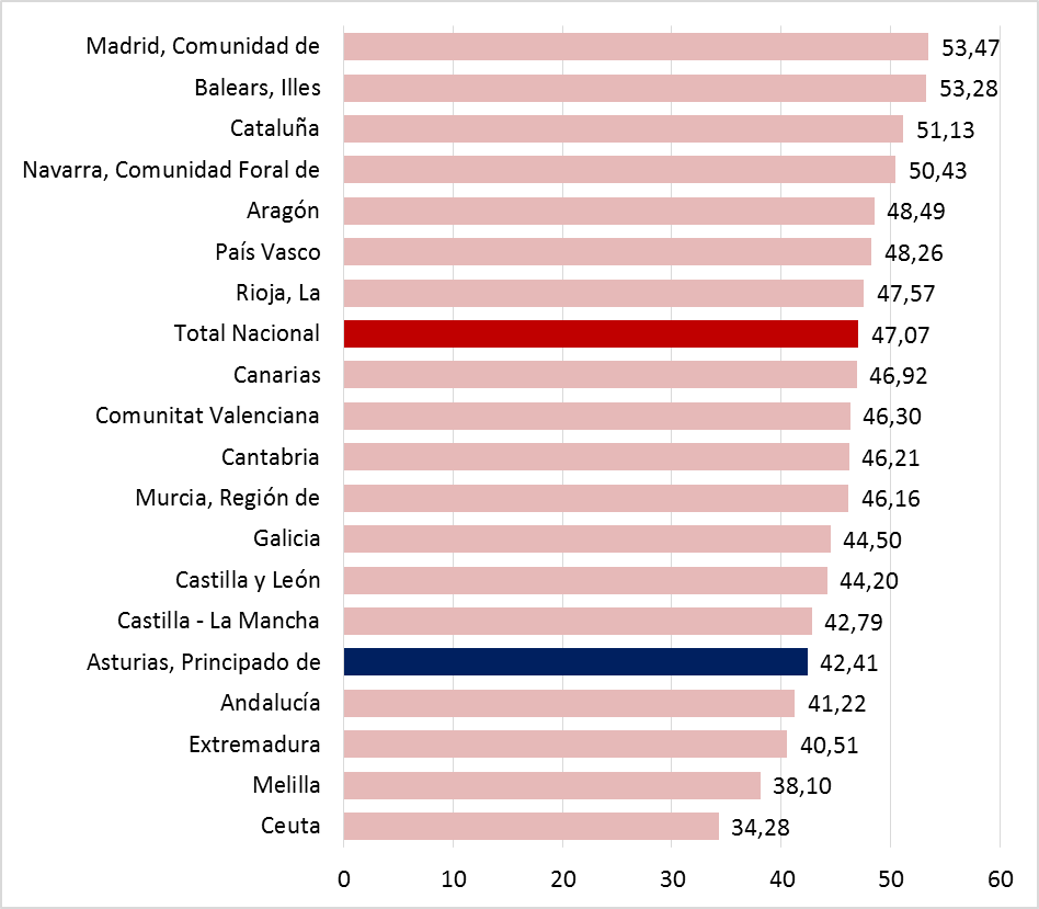 En relación con el resto de Comunidades Autónomas, la tasa de empleo de las mujeres en Asturias es la quinta más baja, por encima de Ceuta, Melilla, Extremadura y Andalucía. La tasa de empleo de los asturianos es la segunda más baja del país, sólo detrás de la de Melilla.